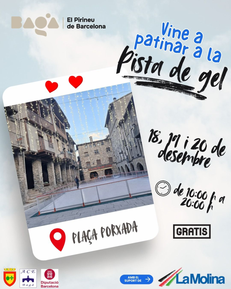 A la Plaça Porxada de Bagà s’hi pot gaudir d’una pista de gel gratuïta els dies 18, 19 i 20 de desembre de 2025. La pista està oberta de 10 h a 20 h i convida petits i grans a passar una estona divertida en un ambient plenament nadalenc.