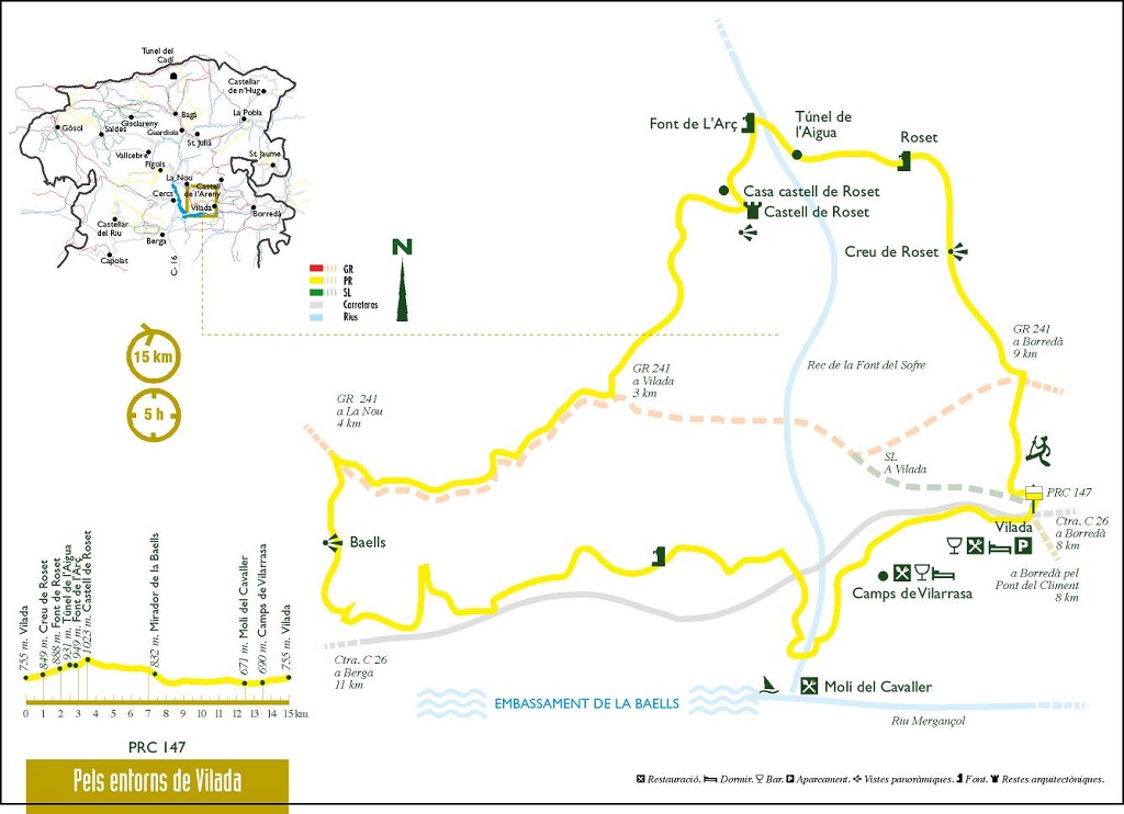 Aquesta comarca està plena de racons que, en poca distància, ofereixen múltiples sorpreses i curiositats. El tram nord d’aquesta ruta n’és un; sobre un fons de muntanyes calcàries de formes impressionants, aquesta ruta va desgranant alguns secrets del passat recent i llunyà d’aquest territori. El túnel de la mina, el castell de Roset i l’embassament de la Baells en són alguns exemples.
