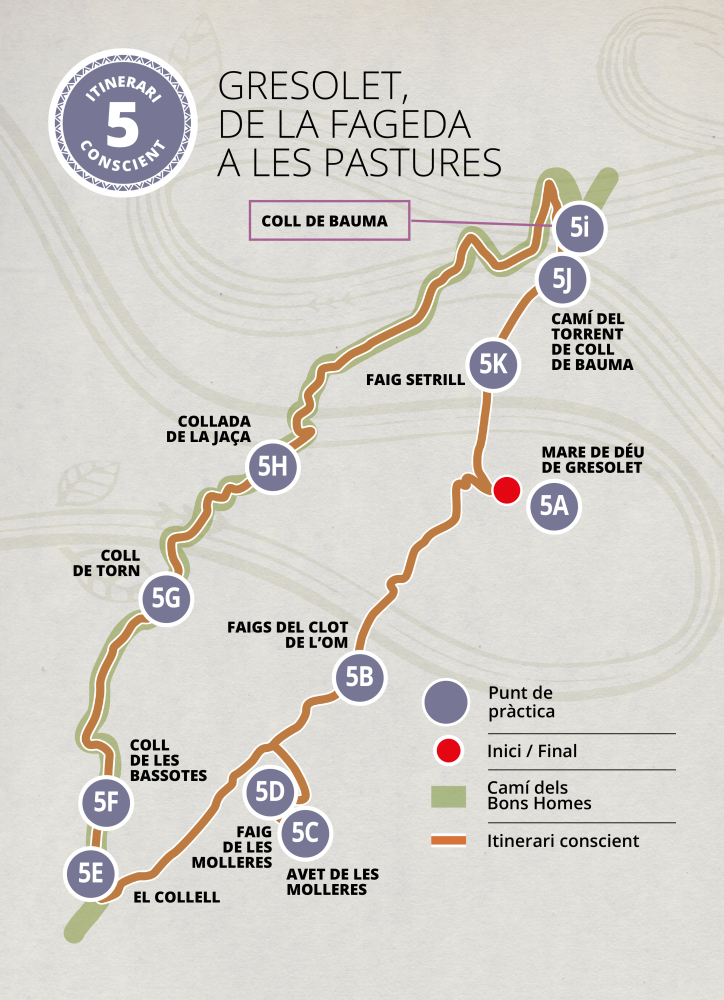 Des del Santuari de Gresolet, un primer tram de camí entretingut per dins la màgia de la fageda de Gresolet, que a més dels arbres monumentals senyalitzats, n’hi ha molts altres faigs, avets i pins de gran embargadura dignes de fer-hi una aturada.