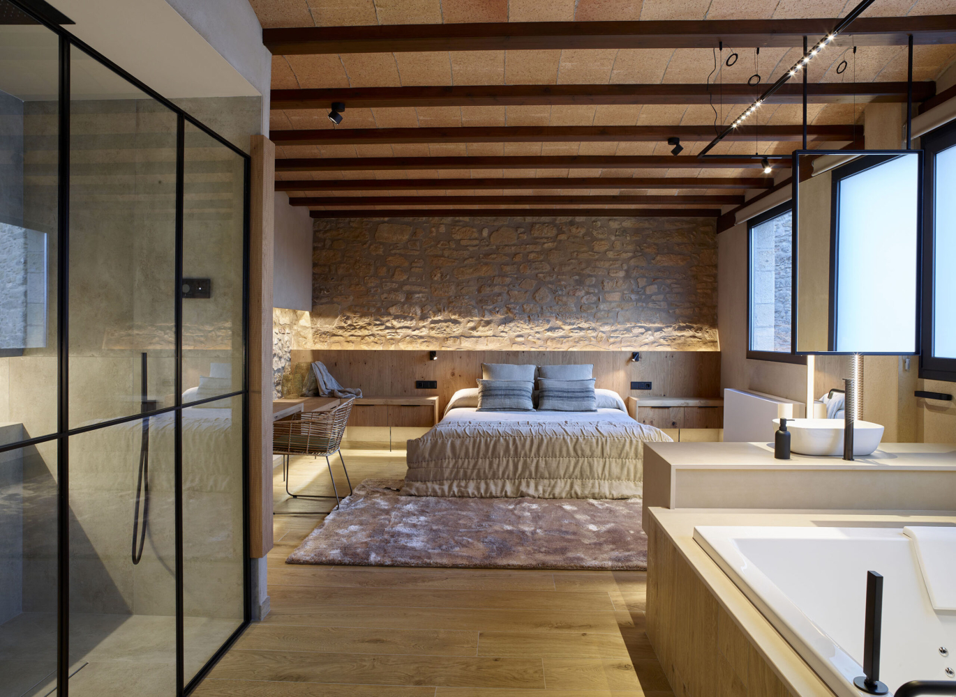 Disposem d’un apartament per a 2 persones equipat amb cuina, sala d’estar amb sofà-llit i TV, bany amb dutxa i banyera d’hidromassatge i llit doble. A més a més, d’una terrassa amb cuina, barbacoa i zona de descans.