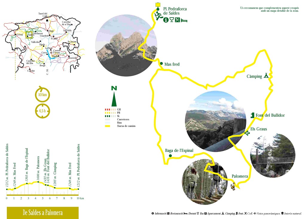 Nota: Si no se quiere repetir el cruce del río Saldes y la subida al pueblo, podéis coger la carretera de l'Obaga después de pasar por Maçaners y aparcar el coche en cualquier lugar con espacio suficiente entre el punto de bajada y el punto de subida de la ruta.