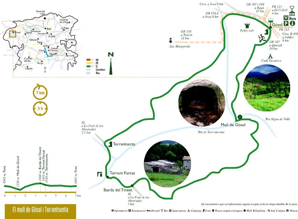 La ruta comienza en la plaza mayor del pueblo y sigue la carretera principal dirección Saldes, hasta llegar a la rotonda de entrada al pueblo donde se continúa por la pista forestal que va a la derecha. En este punto hay una fuente moderna, junto a la que sale el agua potable del pueblo y donde se pueden llenar las cantimploras antes de comenzar a caminar. Desde aquí, tanto si miráis hacia el norte, en la costa de enfrente, como si miráis hacia el sur o hacia la colina del antiguo pueblo, veréis que todo está lleno de bancales. Son tierras marginales, áridas, donde era necesario mucho trabajo para muy poco rendimiento y que contrastan con la riqueza de las tierras que más adelante recorreréis.