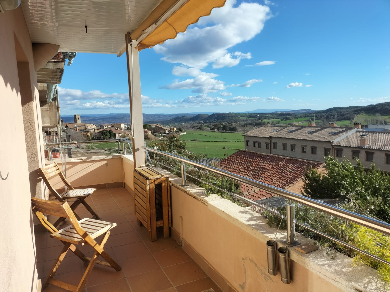 Entra el sol desde el mediodía al atardecer (toldo para resguardarse y mesa exterior).