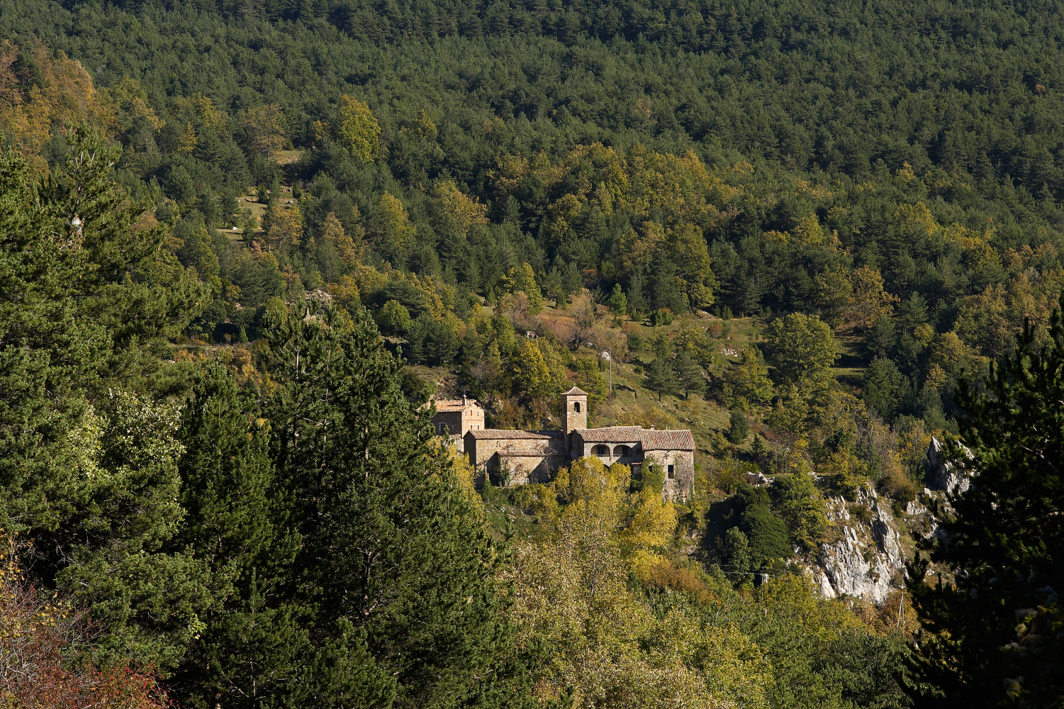 Après avoir monté une partie du chemin de la Fusta, notre chemin tourne vers la droite, serpente pour ensuite descendre vers le ruisseau de Metge et un lotissement moderne; il traverse la route qui va aux Rasos de Peguera et reprend l’ancien chemin vers l’église. Celle-ci n’a rien de remarquable, mais à l’arrière on peut voir un replat élevé et des murs périmétraux. À cet endroit s’élevait le château de Guillem de Berguedà, un des grands troubadours catalans qui écrivit de beaux vers d’amour, mais aussi des satires mordantes sur ses contemporains ce qui lui valut beaucoup d’ennemis et qui, finalement, fut la cause de sa mort.