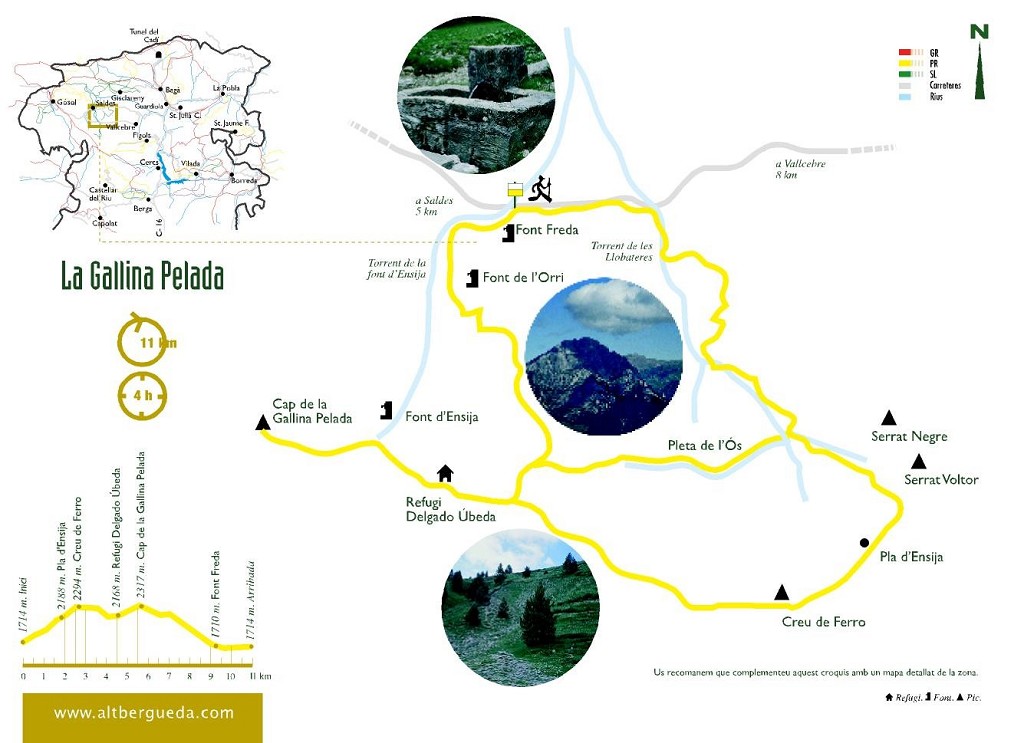 Vous arriverez finalement au Cap de la Gallina Pelada, un belvédère extraordinaire sur les régions avoisinantes : Villages de Saldes, Gósol, Maçaners... Et les environs : Cadí-Moixeró, Montseny, Montserrat... Une fois vos impressions rédigées dans le livre du sommet et que vous aurez contemplé à plaisir le paysage, vous pourrez commencer le retour. Vous descendrez en sens inverse le sentier par lequel vous êtes montés, mais lorsque vous commencerez à descendre doucement, vous bifurquerez vers la gauche, en direction nord. Un piquet de fer vous aidera à localiser l'entrée du torrent par lequel vous descendrez. Vous descendrez au milieu des prés. Juste devant, au fond, vous distinguerez la Tosa et les Penyes Altes de Moixeró. A vos côtés, vous longerez une petite colline sur sa gauche. Le sentier bien délimité descendra de plus en plus et vous pourrez jouir de vues imprenables sur la face sud du Pedraforca, avec le village de Saldes sur son flanc. Vous verrez une colline plus pointue que vous longerez aussi sur sa gauche. Vous verrez ensuite, sur le côté, un torrent qui s'éloigne sur la gauche et vous prendrez vers la droite pour déboucher sur des plaines. Vous les traverserez puis tournerez vers la gauche pour suivre un sentier bien marqué que vous amènera jusqu'à la rive du torrent de la Font d'Ensija, en zigzaguant à travers une forêt de plus en plus épaisse. Le chemin est escarpé et plein de pierres. Faites très attention aux foulures et aux glissades.