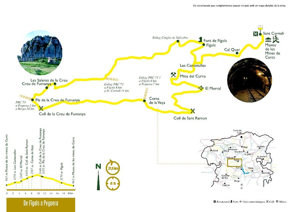 L'itinéraire commence devant le musée des mines de Cercs et se dirige vers le sud le long du sentier Llobregat (GR 270). La piste cessera bientôt d'être pavée alors qu'elle se dirige vers l'ouest en direction de Fígols. Vous passerez par quelques poubelles et les maisons de la Quer et de la Cal Gorra, et au prochain virage vous quitterez les marques GR et pour suivre celles du PR-C 73, par la piste à droite qui va maintenant monter de courage, vers Cal Calderer. Lorsque vous atteignez la piste pavée, suivez-la vers la gauche jusqu'au charmant noyau de Fígols, actuellement l'une des municipalités les moins densément peuplées de Catalogne; peu d'habitants et beaucoup de terrain. L'église romane de Santa Cecília (XI - XII) est remarquable