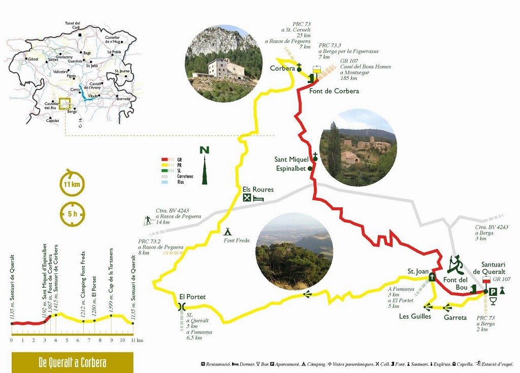 Signalisation: Marques vermelles i blanques (GR 107) de Queralt a Corbera; marques grogues i blanques de Corbera a Queralt (PRC-73).